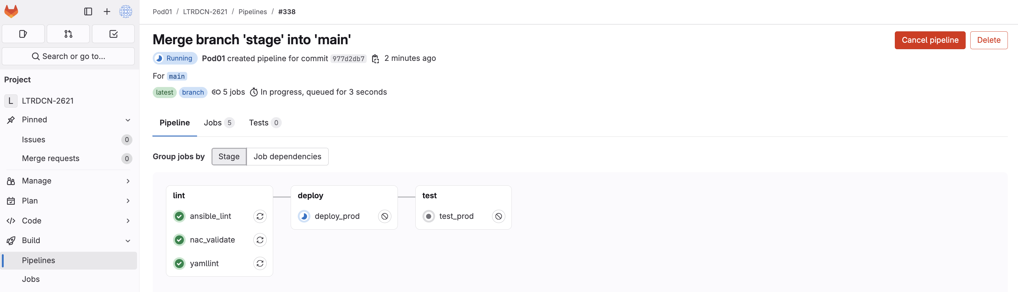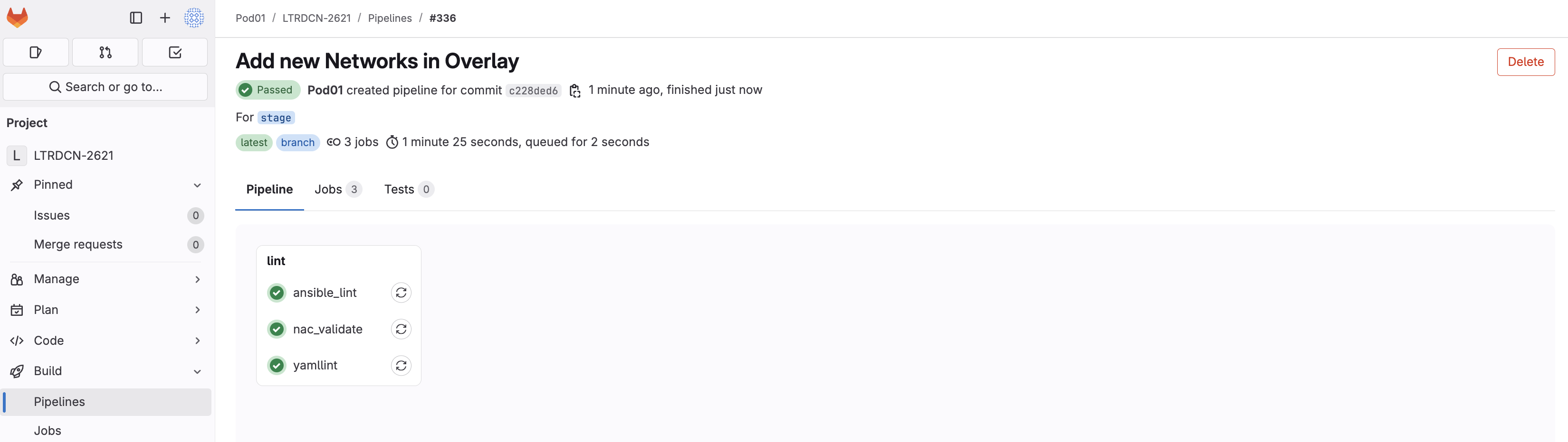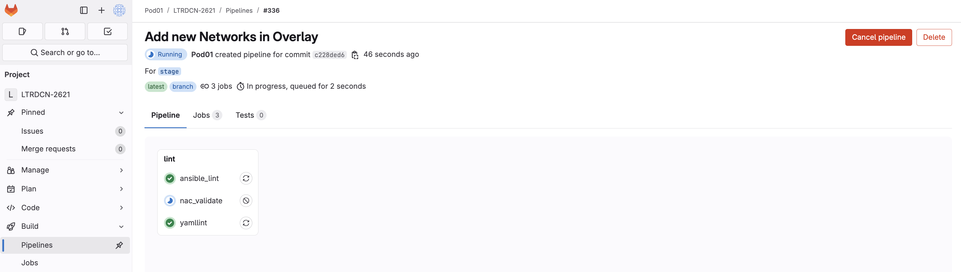As soon as the code was committed to the stage branch, Ansible Lint validation was triggered. Return to your GitLab and navigate to Pipelines: