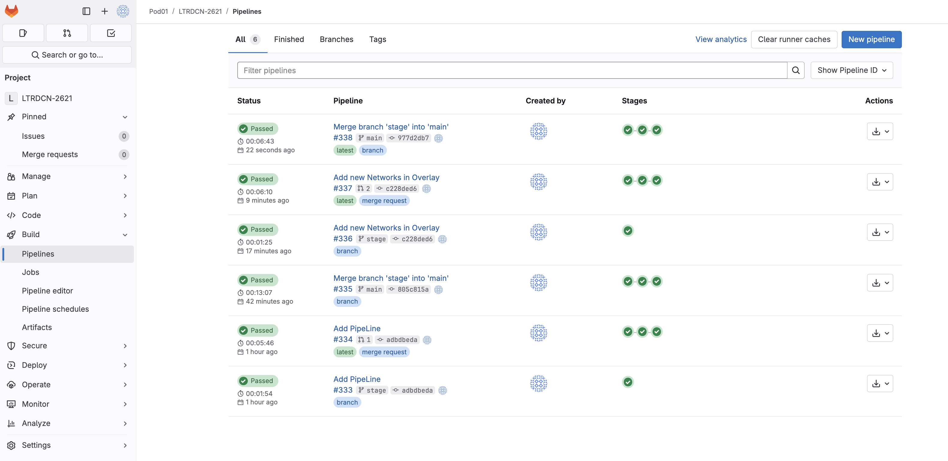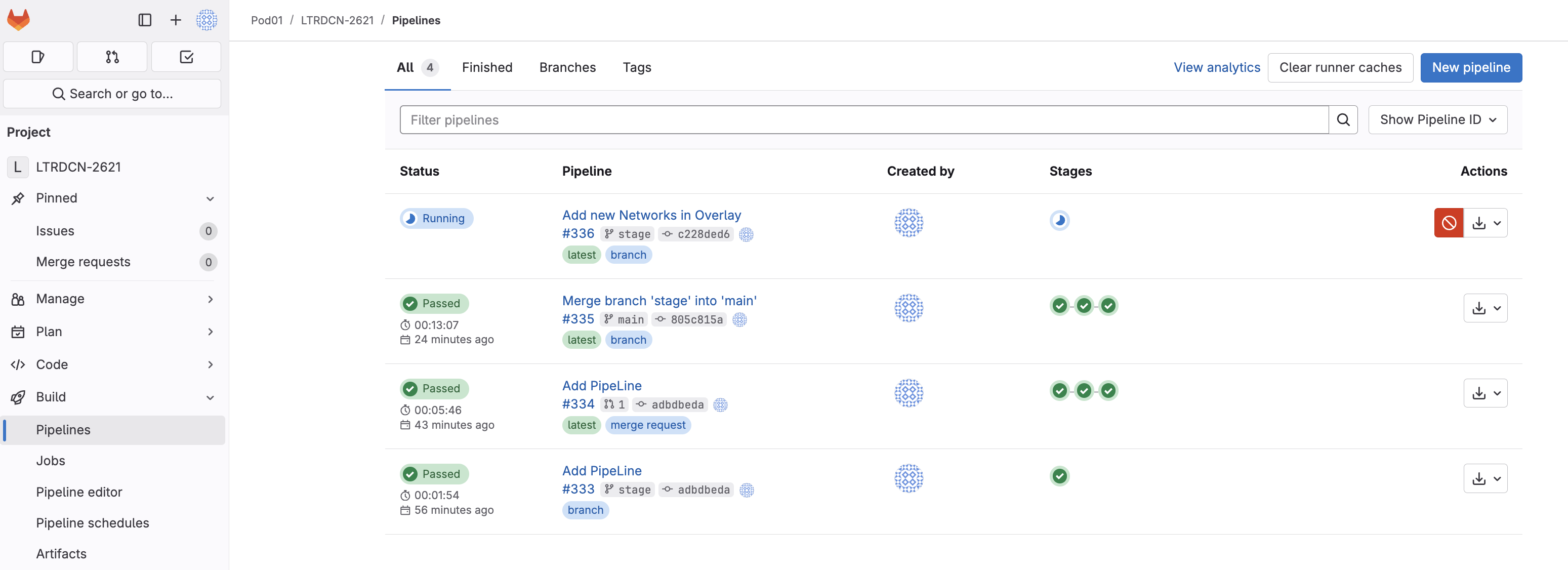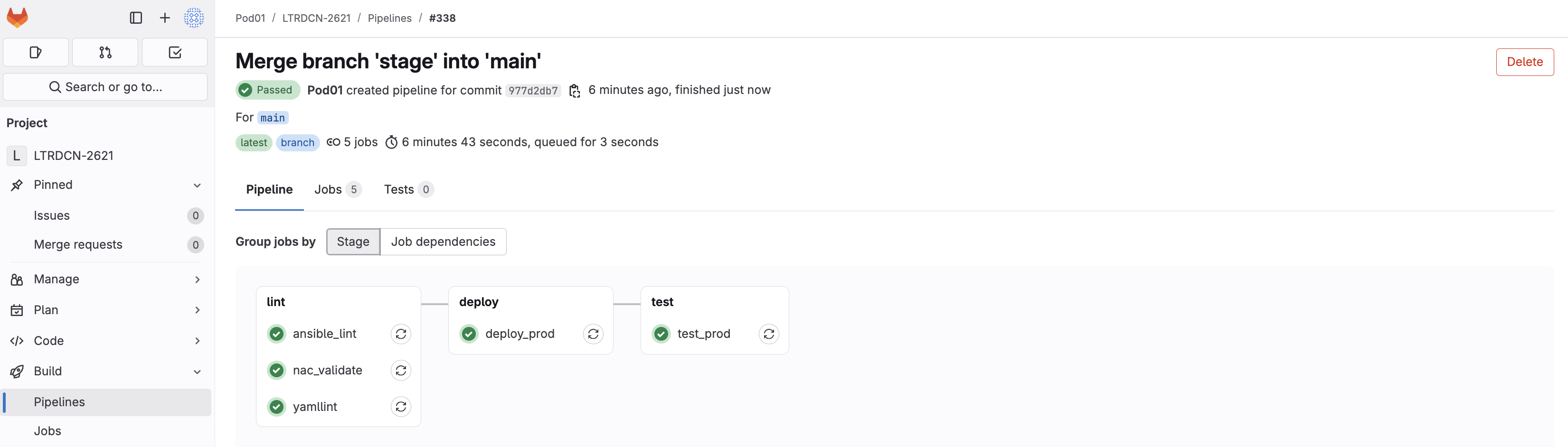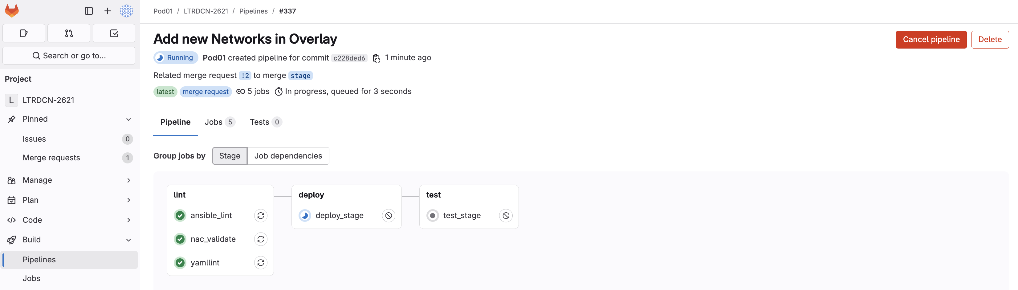 As soon as the code was committed to the stage branch, Ansible Lint validation was triggered. Return to your GitLab and navigate to Pipelines: