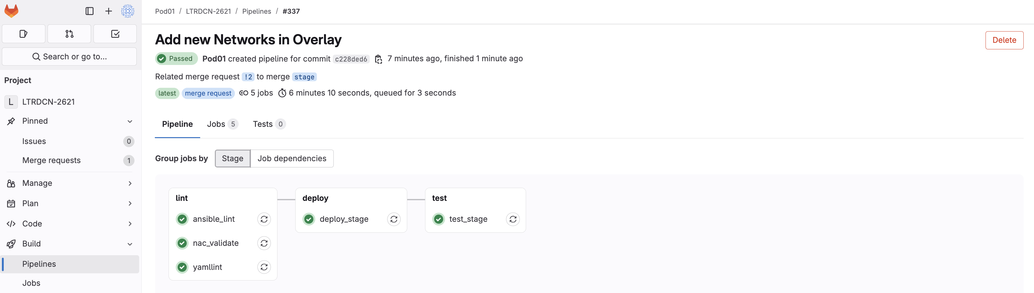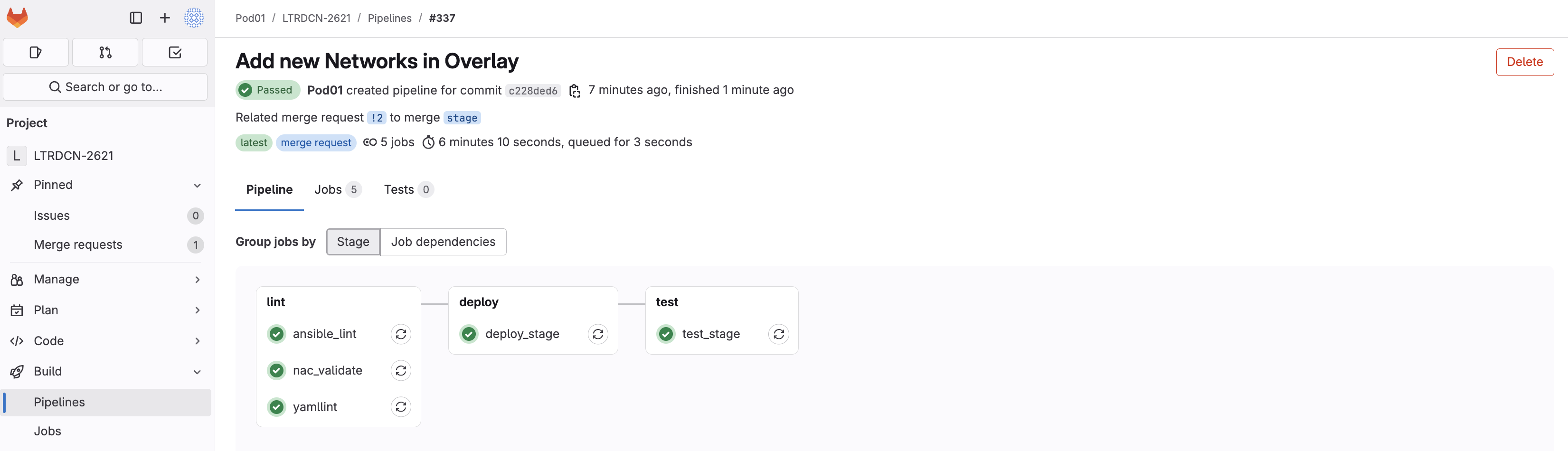 In this final section for Ansible you are going to use your newly built pipeline to add a new Network. This demonstrates how easy it is to make changes to your Network stored in GitLab as code and validate those changes against your staging fabric before pushing the changes to your production fabric.