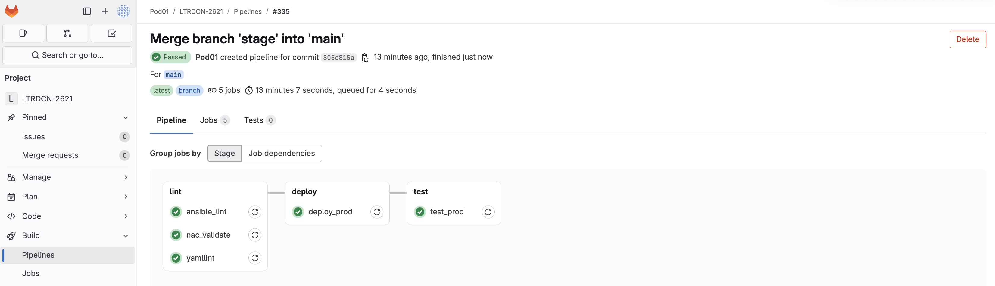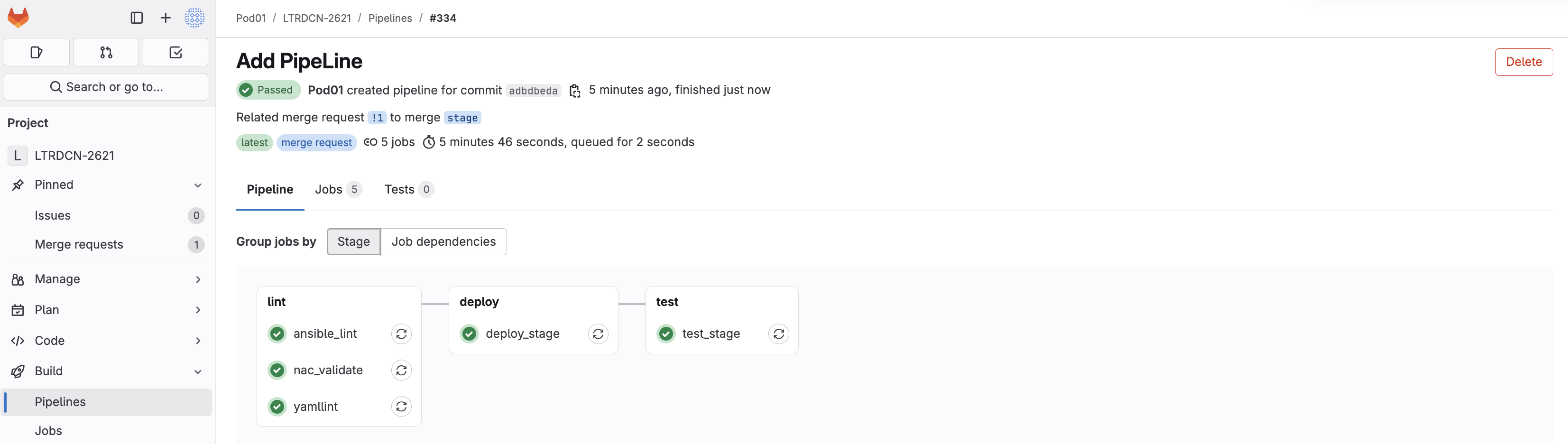 Click the !# link in the text Related merge request !# to merge stage. In the screenshot below the link is !1