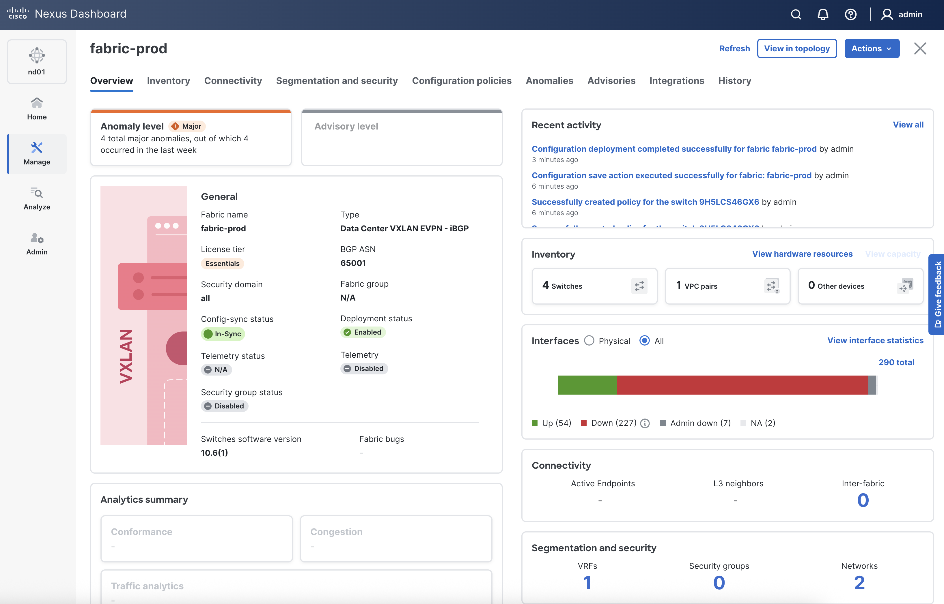 Examine your prod fabric's Overview page. You should see a total of 4 switches, 2 L2VNIs (Networks), and 1 VRF.
