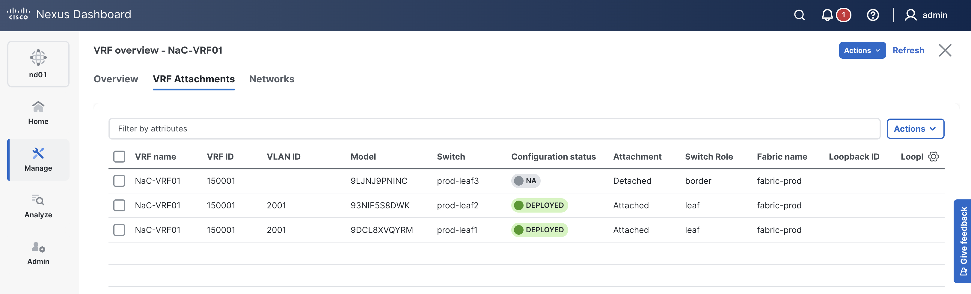Click on VRF Attachments to view the VRF attached to your prod leaf switches.