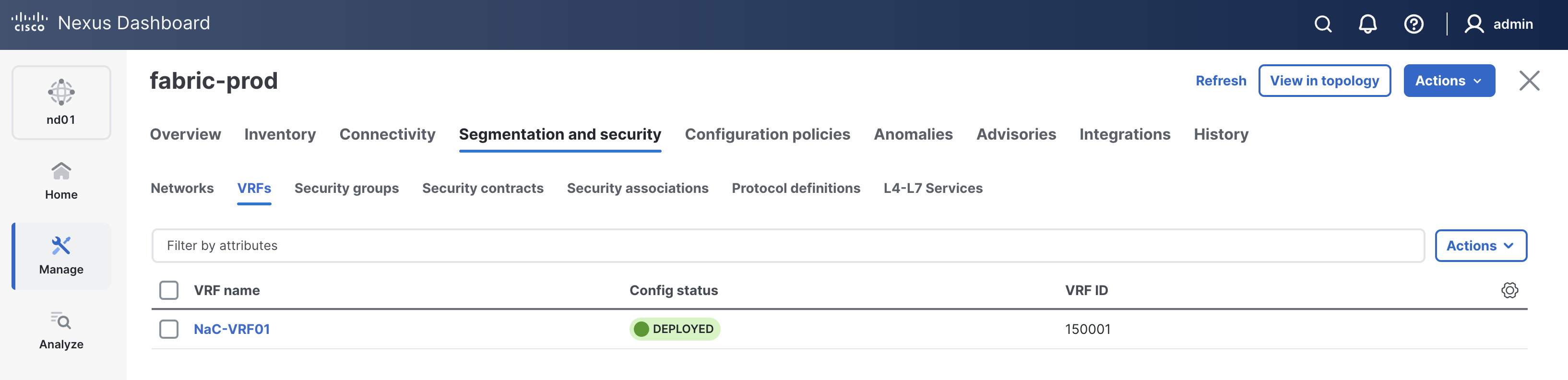 Click on VRFs in the sub-navigation bar to view the VRFs added to your prod fabric. As you can see, it is the identical configuration intent you tested with your staging fabric.