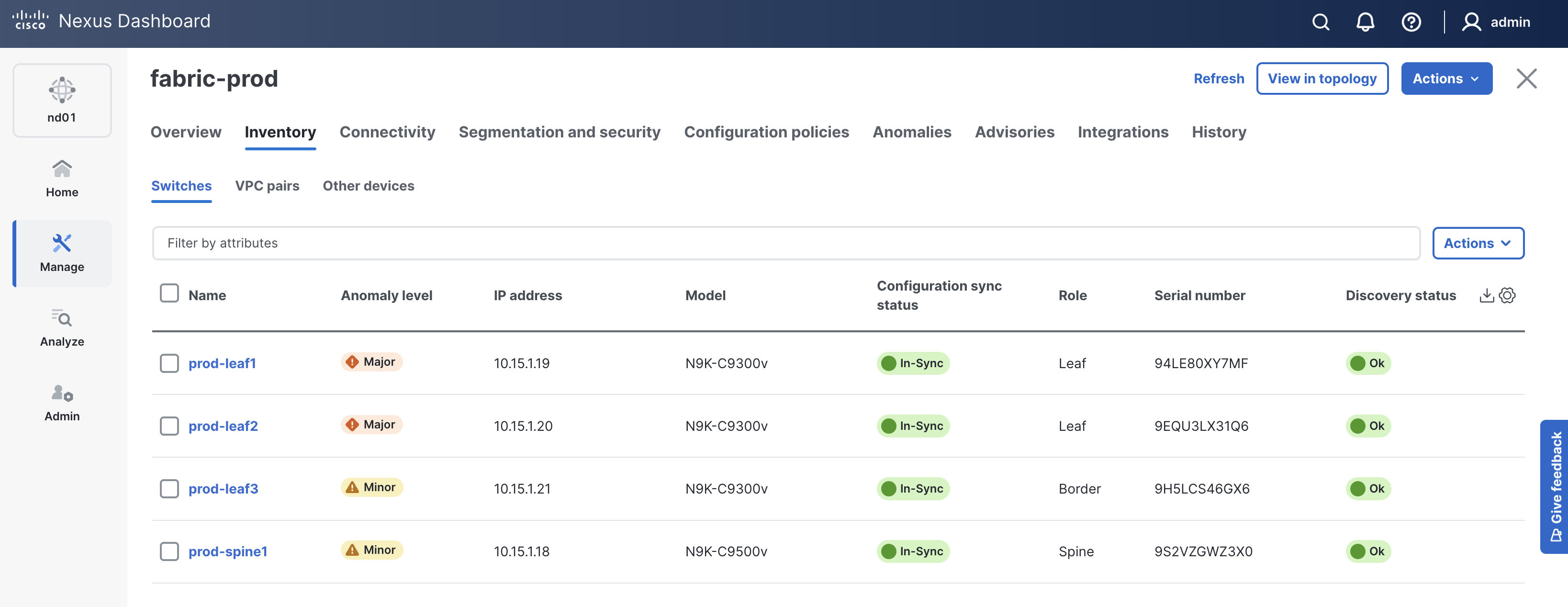 Click on Switches in the sub-navigation bar to view the switches added to your prod fabric and where the overlay configuration was configured