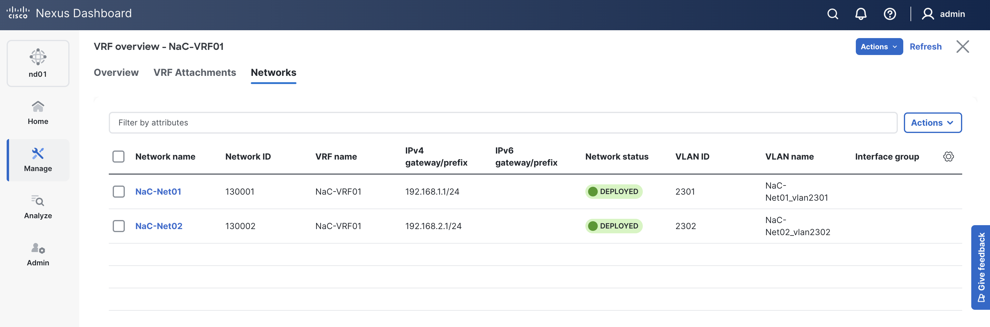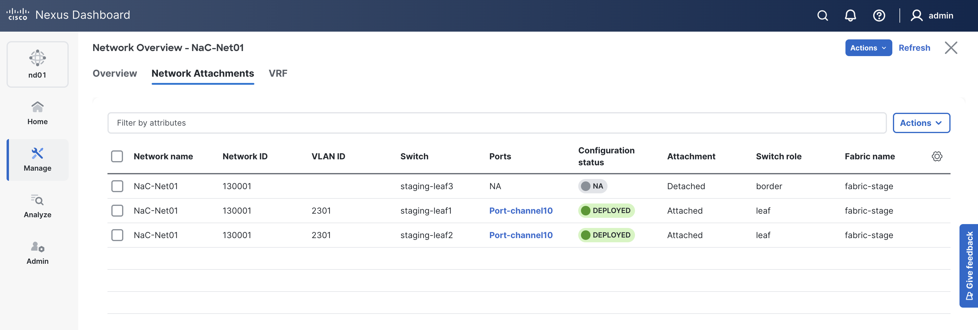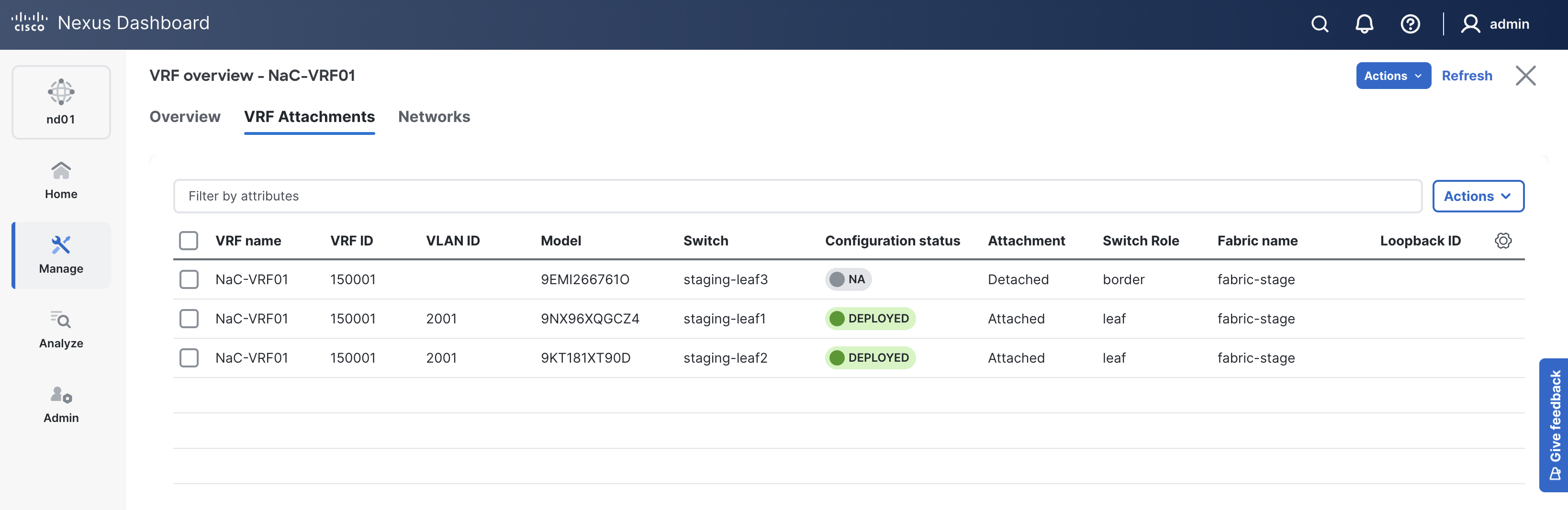 Up to this point, all of the switch, Interface, VRF, and Network configurations have been pushed to ND. However, their Config Status shows as Pending since you have yet to actually deploy this configuration.