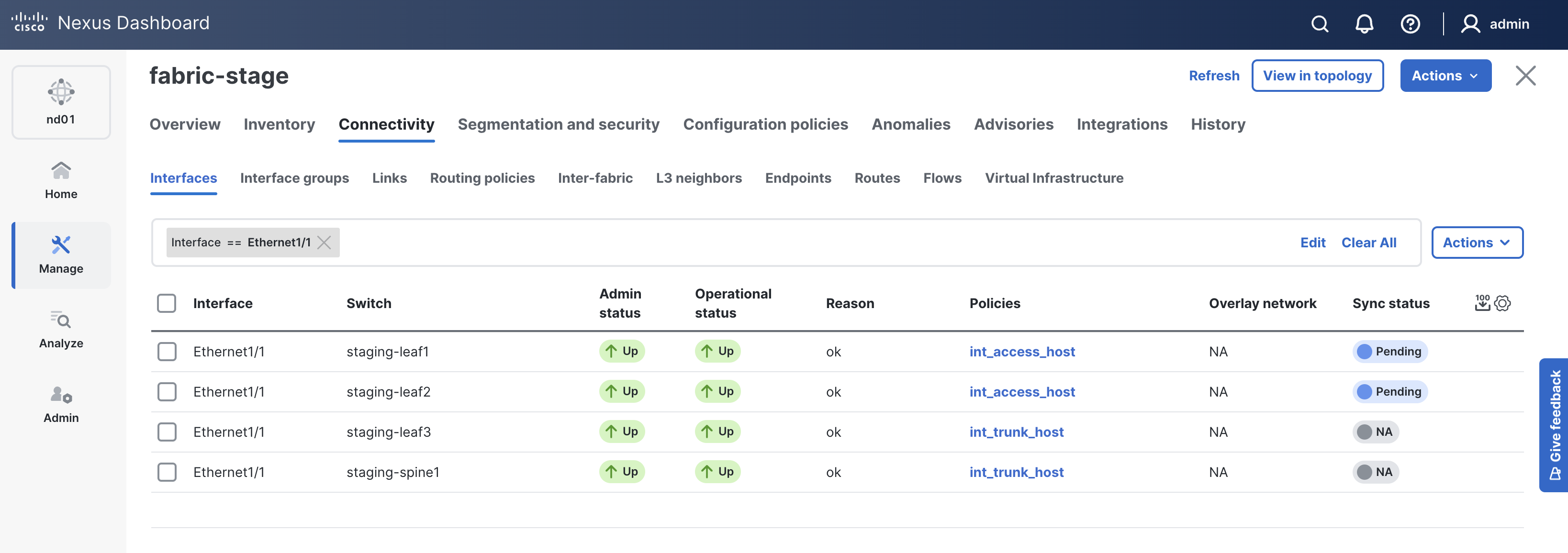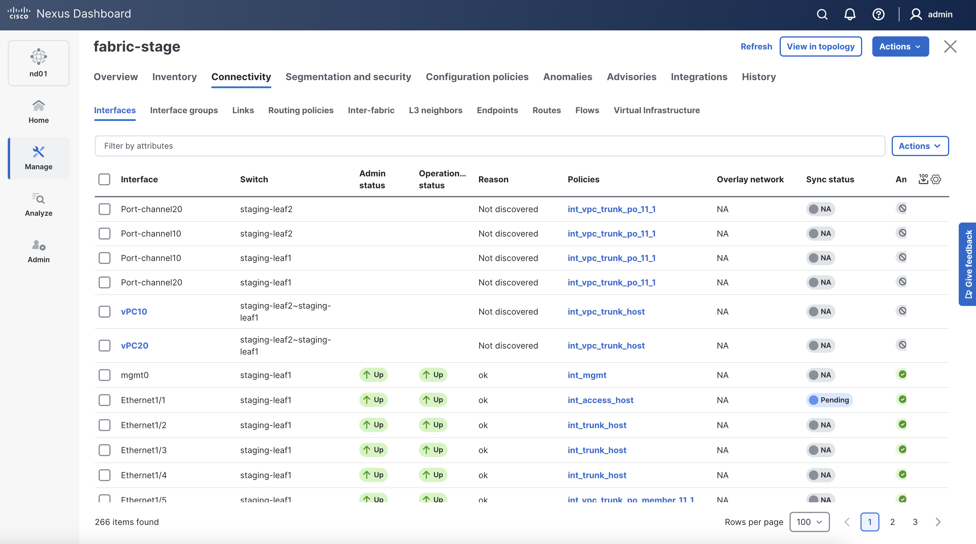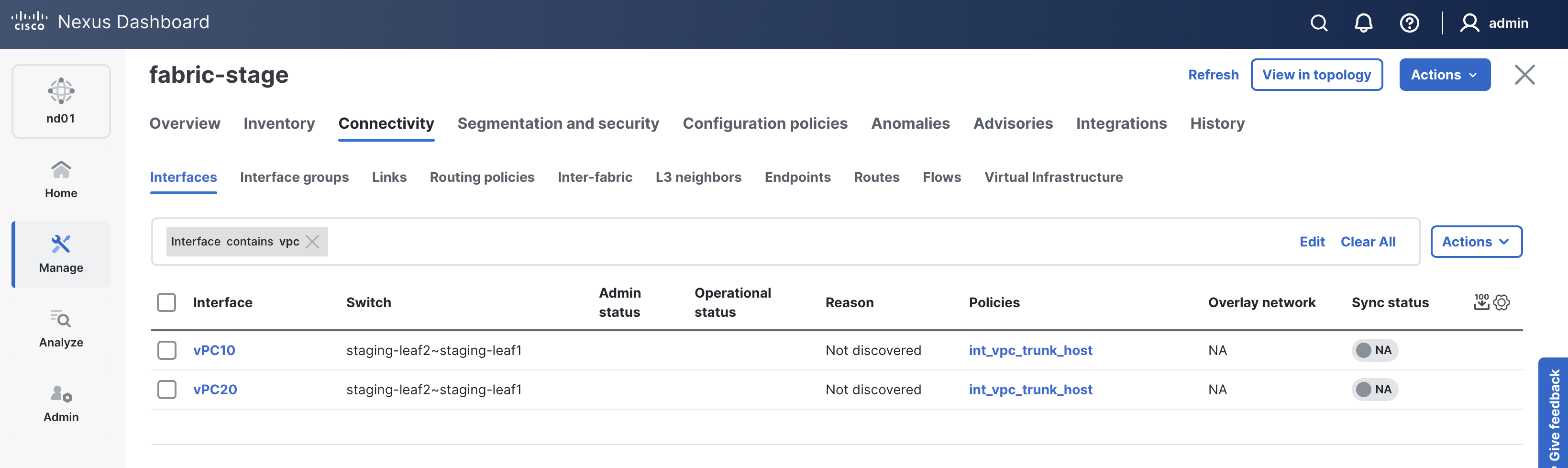 enterMake sure Interfaces vPC10 and vPC20 are created between staging-leaf1 and staging-leaf2 and they are NA under Sync Status. These will change to In-Sync after the deployment role is completed later in the lab.