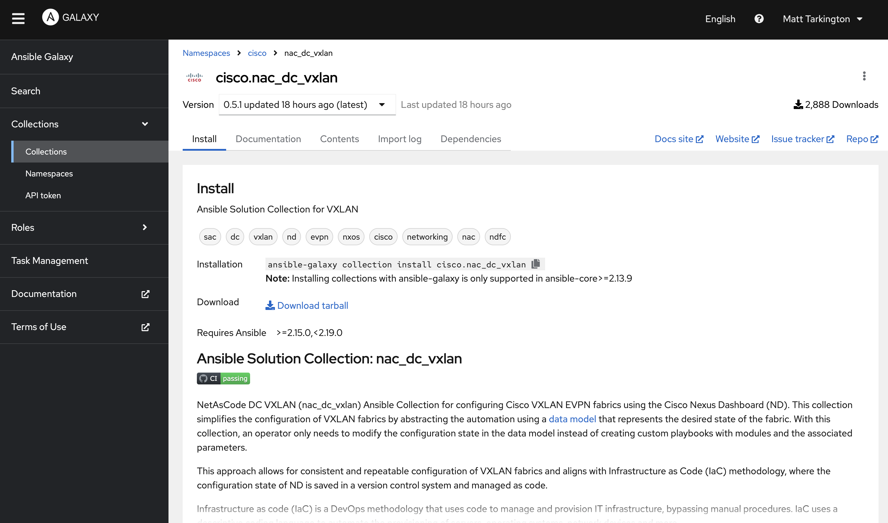 All documentation for the VXLAN as Code, nac_dc_vxlan, Ansible collection can be found on Ansible Galaxy. Navigate to Ansible Galaxy to see the list of modules and review the documentation.