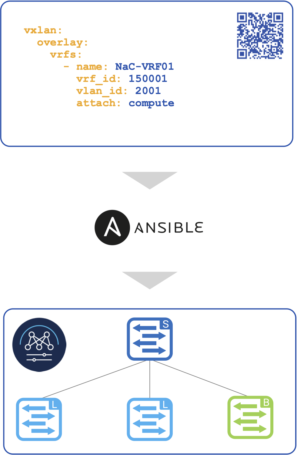 It allows users to instantiate network fabrics in minutes using an easy to use, opinionated data model and takes away the complexity of having to deal with references, dependencies or loops. Users can focus on describing the intended configuration while using a set of maintained and tested Ansible Modules without the need to understand the low-level network device configuration.