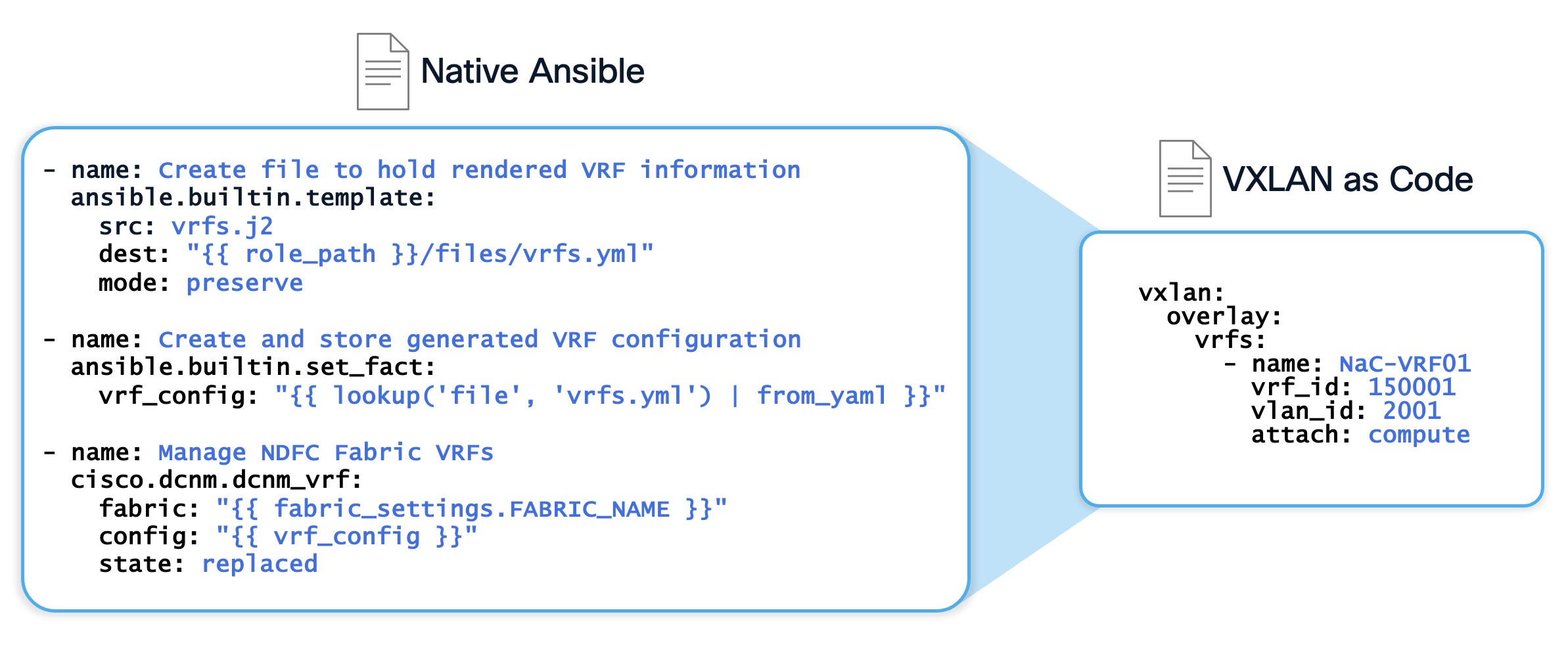 VXLAN as Code aims to reduce time to value by lowering the barrier of entry to network orchestration through simplification, abstraction, and curated examples.